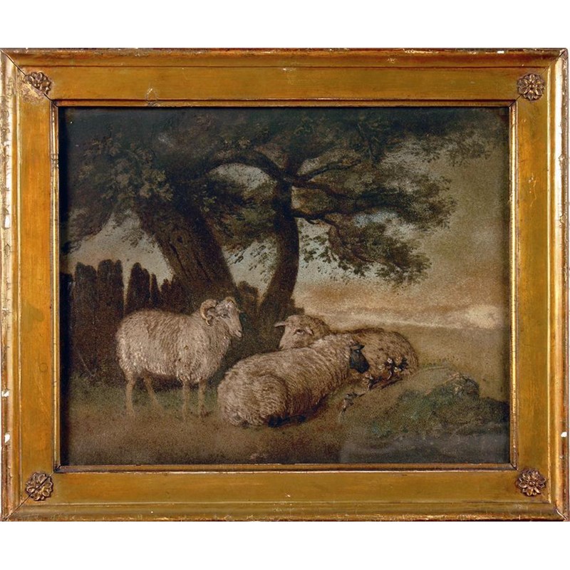 Manner of Benjamin Zobel (1762 - 1831). An early 19th century sand picture, three sheep under an oak tree, 12.25 x 15in (31 x 38cm).