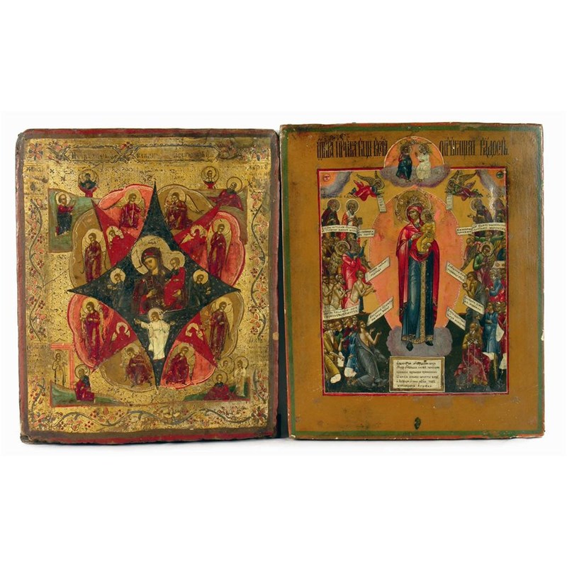 A 19th century Orthodox icon, centred The Virgin Mary with infant Christ, surrounded by prophets, 12.5 x 10.25in (31.5 x 26cm) and another with a foliage decorated border. (2)
