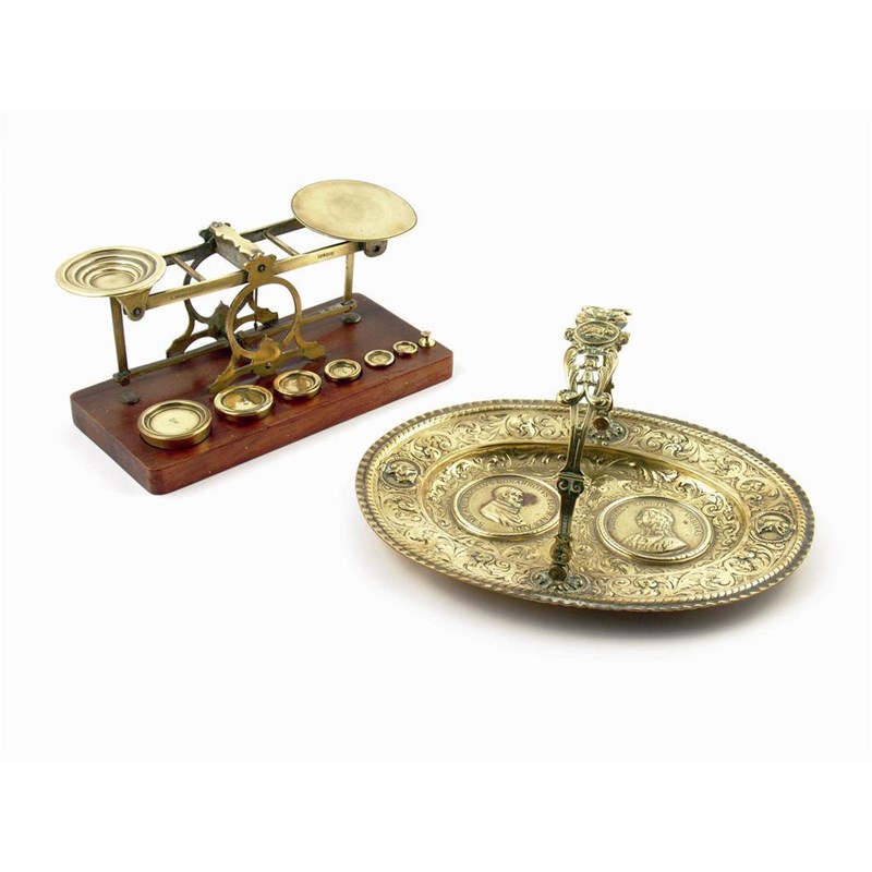 A cast brass oval swing handled dish, the centre with portrait medallions of Michelangelo and Raphael, the underside with 'AFC' in a hexagon, 6in (15cm) h, 11.5in (29cm) w, and a set of brass scales by S. Mordan & Co, London, with weights. (2)