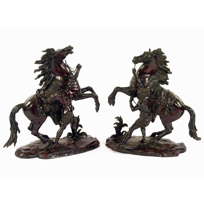 After Coustou. A pair bronze Marly horses, each rearing on hind quarters with attendant, 23in (58.5cm). (2)