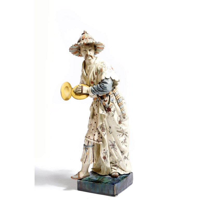 A late 19th century continental pottery figure of an oriental musician, the base with a raised banner mark inscribed 'Wittmann & Roth London' and numbered '145', 44.2cm high.