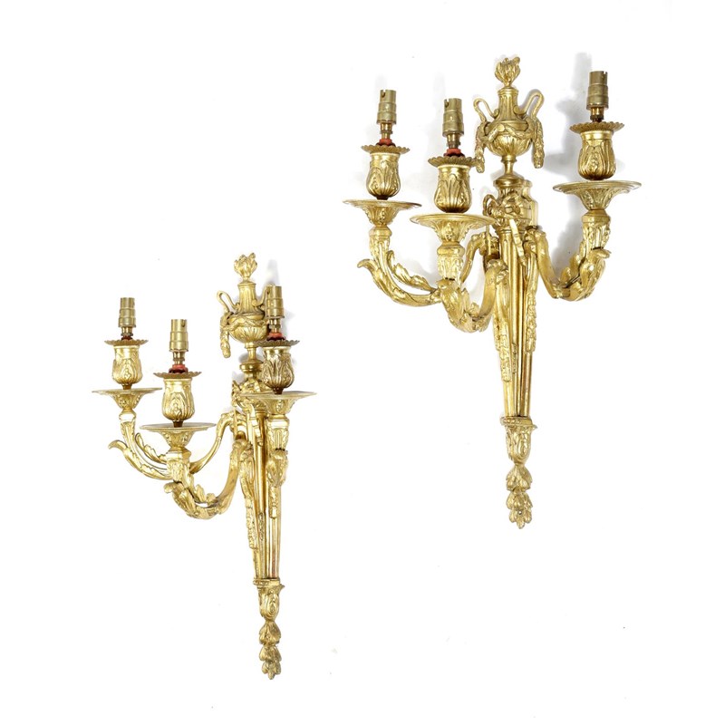 A pair of late 19th century French ormolu wall lights in Louis XVI style, with a flaming urn and ribbon tied fluted backplate, with leaf decorated scroll arms and three sconces, the backs stamped 'G D 126', 50.4cm high, 30.5cm wide. (2)