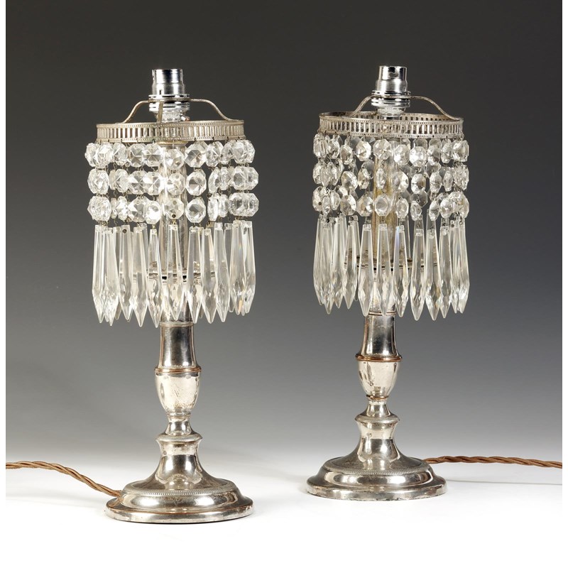 A pair of Victorian silver plated lustre table lamps, later converted with cut glass drops and lustres, with a vase turned stem and a circular base, 32.5cm high (excluding fitting). (2)