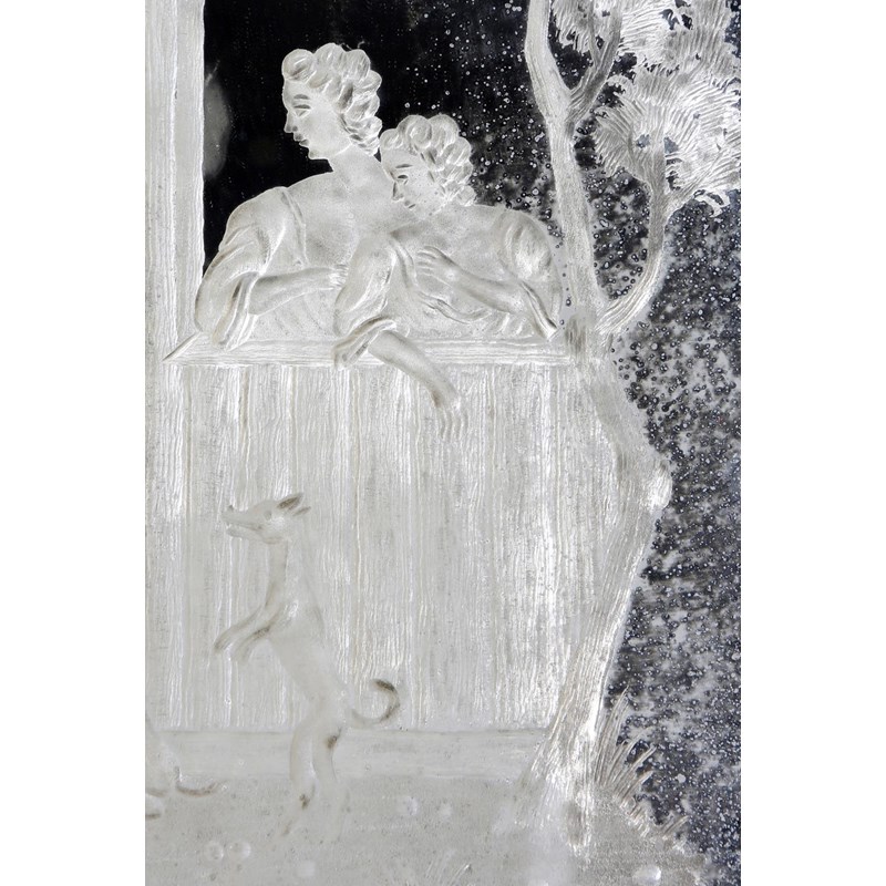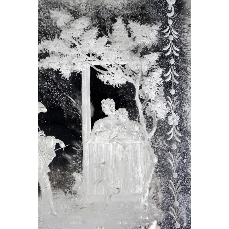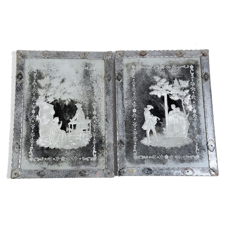 A pair of Italian Venetian wall mirrors, each with a rectangular plate etched with country scenes, one with a drummer with two ladies and their dogs, the other with two huntsmen, one seated smoking, the other drinking with his hound, the panels possibly late 18th century, later mounted, 49.2 x 37.1cm. (2)