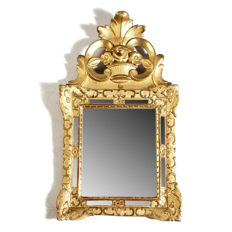 A Louis XV provincial carved giltwood wall mirror, with a rectangular plate surrounded by marginal plates, the re-gilt frame decorated with leaves and scrolls and with a 'C' scroll and basket of flowers surmount, 79.8 x 44.8cm.