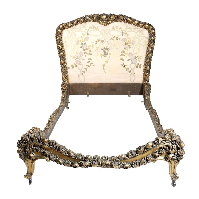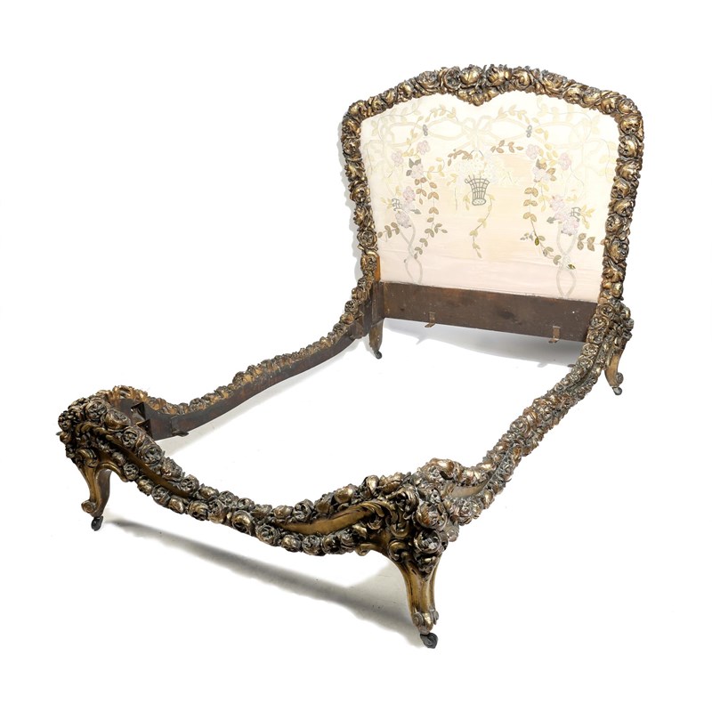 A continental giltwood bed, the frame all over carved with flowers, the headboard with a needlework panel of a basket of flowers and further flowers and foliage, on cabriole legs and later castors, 155cm high, 145cm wide, 206cm long.
