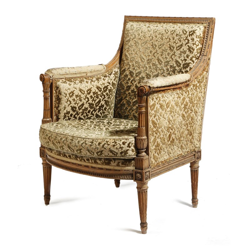 A French beechwood bergère in Louis XV style, the moulded frame with a padded back and armrests, with stop fluted and stiff leaf carved arm supports and fluted tapering legs.