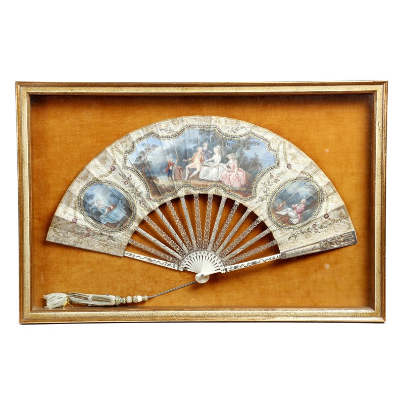 λ A late 18th century French silk fan, the ivory sticks with gilt and silvered decoration, the fan applied with sequins, with swags, flowers and leaves and with three gouache painted panels, depicting a family in a woodland setting marvelling at a clock, and a man and a woman playing instruments, 50.5cm wide, in a later glazed rectangular display case.