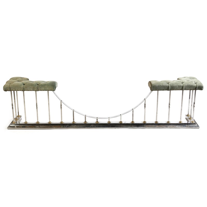 A modern white metal and brass club fender, with button upholstered green suede leather seats, 53.3cm high, 217.5cm wide, 36.5cm deep.
