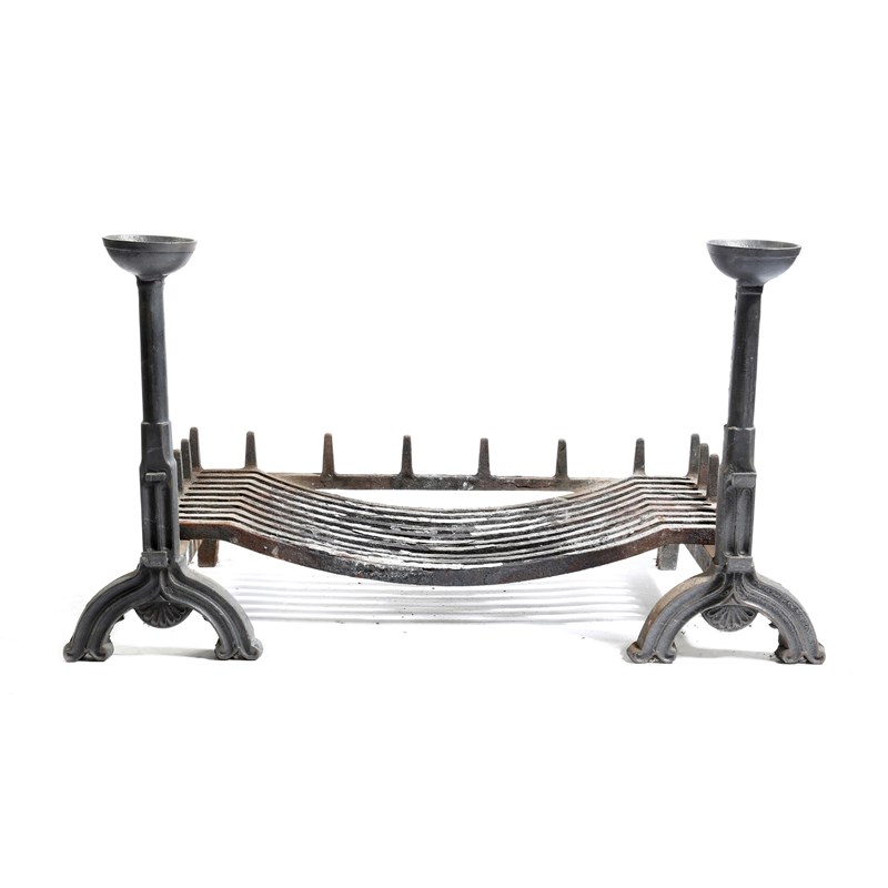 A cast iron fire-grate, comprising: a pair of andirons with dished tops, above a part fluted stem and scroll supports, together with railed basket, 61.5cm high, 90.5 + 26cm wide, 62cm deep.