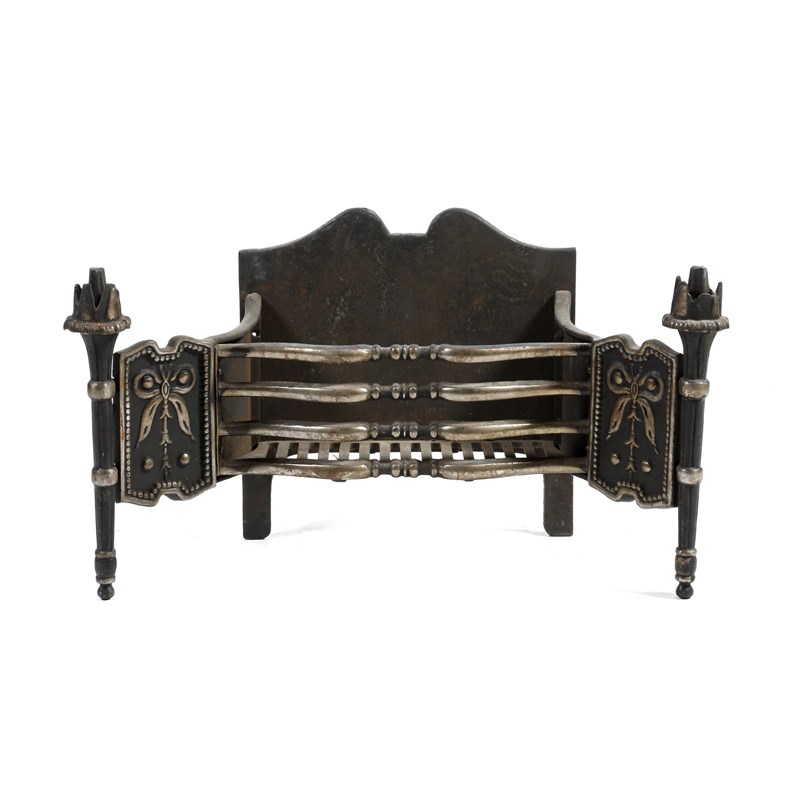 A cast iron fire-grate, with a railed front, flanked by ribbon tied husk panels and torch front supports, 45cm high, 81cm wide, 29.5cm deep.