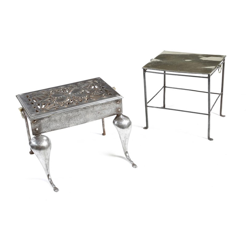 A George III steel footman, the top pierced with fan spandrels, trees and hearts, with brass side carrying handles, 30.8cm high, 46.8cm wide, 41cm deep, together with a brass and iron example. (2)