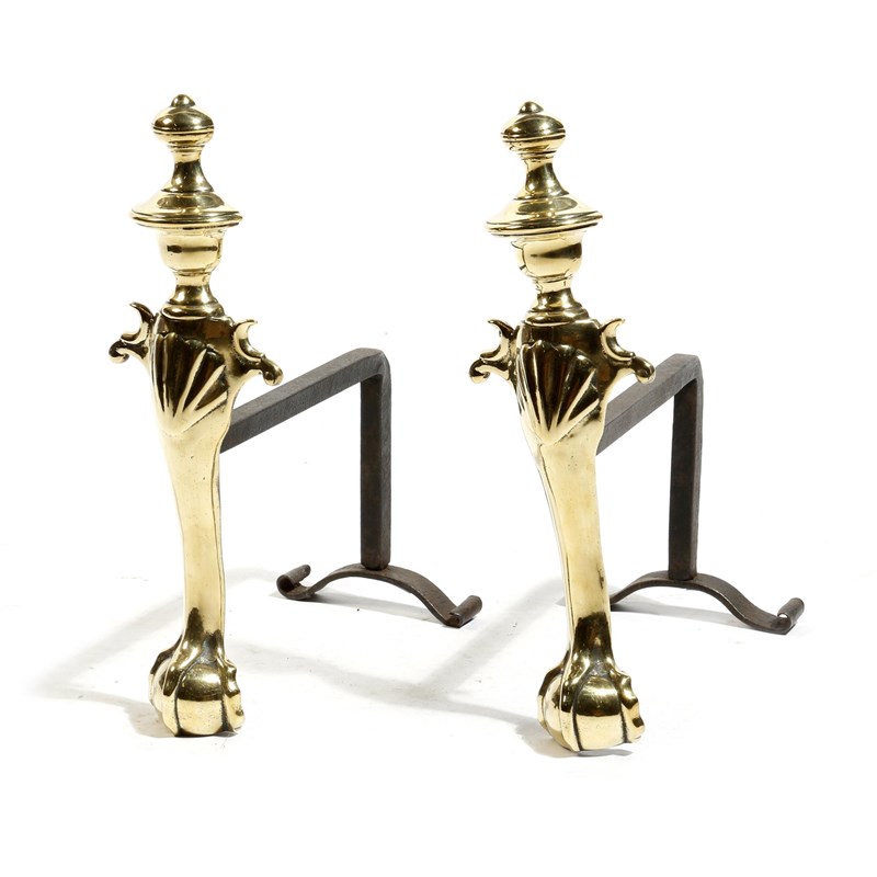 A pair of George II style brass andirons, each with an urn top above a shell capped leg and a claw and paw foot, with an iron support, 39.3cm high, 28.4cm deep. (2)