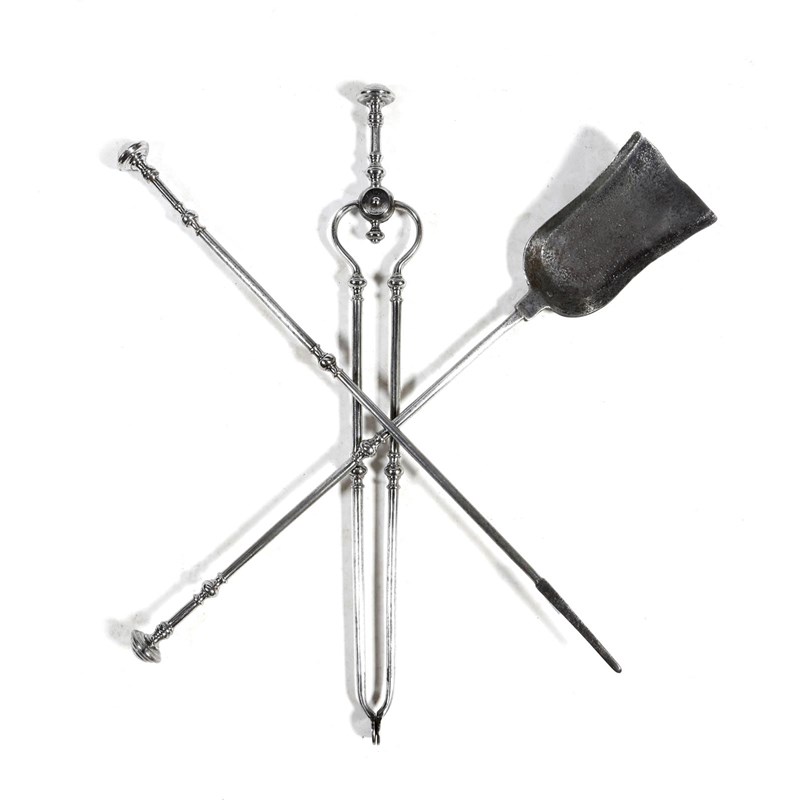 A set of three early Victorian polished steel fire tools, with mushroom finials and knopped stems, 77cm long (max). (3)