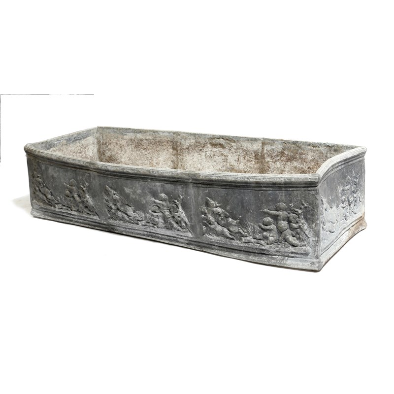 A lead planter, with a moulded rim, above a body decorated with a repeated scene of cherubs hunting a stag, 26cm high, 105cm wide, 38.5cm deep.