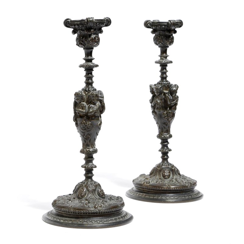 A pair of continental cast bronze candlesticks, each with a leaf and scroll decorated urn nozzle, the stems with cherubs personifying the four seasons, on circular bases, French or Italian, late 18th / early 19th century, 22cm high. (2)