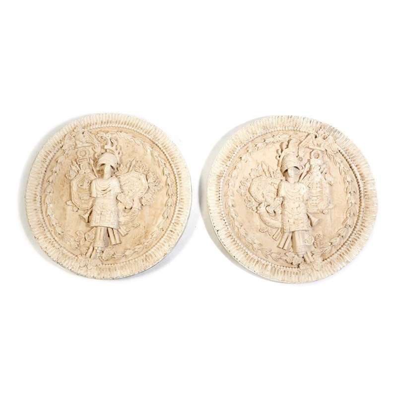 A pair of carved and painted wood Neo-Classical rondels, each decorated with war trophies within a wreath border and with a double headed eagle, 76cm diameter. (2)