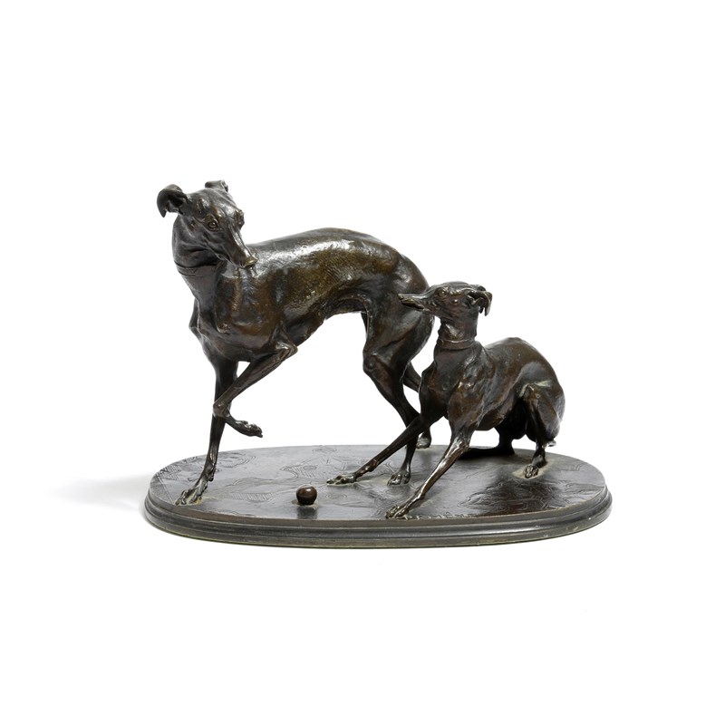 Pierre-Jules Mêne (French 1810-1879). A 19th century bronze of two whippets at play with a ball