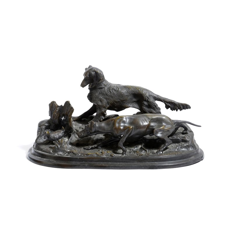 After Pierre-Jules Mêne (French 1810-1879). A bronze group of a setter and a pointer hunting a partridge, signed 'P. J. Mêne', 19.3cm high, 40.1cm wide.