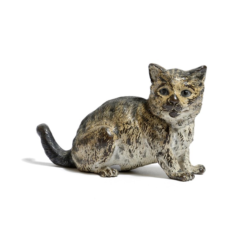 An Austrian cold painted bronze model of a cat, the tail stamped 'GESCHÜTZT', late 19th / early 20th century, 9.4cm long.