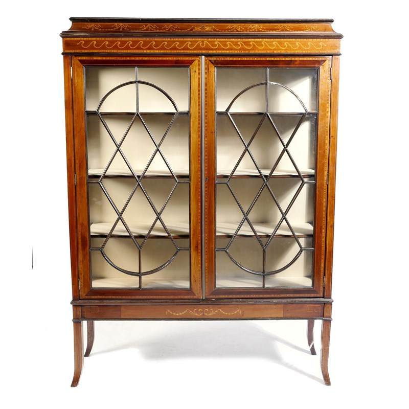 An Edwardian mahogany and marquetry display cabinet, with satinwood banding and inlaid with ribbon tied husk swags and a Vitruvian scroll, with a pair of astragal glazed doors enclosing three shelves, 170.9cm high, 124.5cm wide, 37.2cm deep