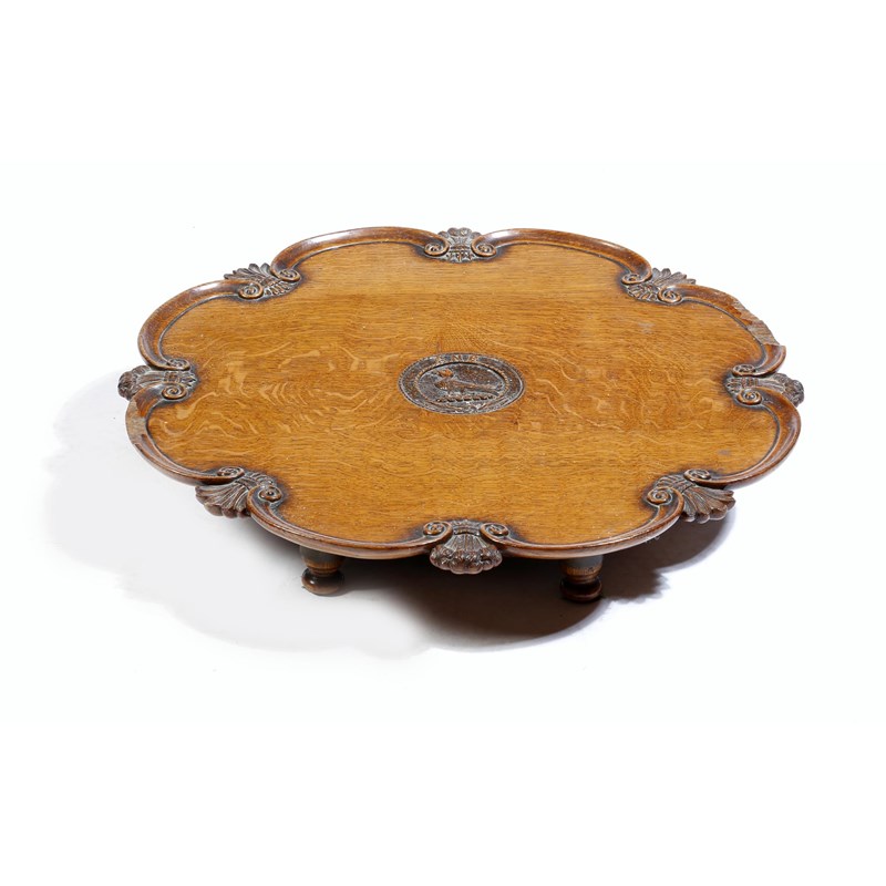 An early Victorian oak lazy Susan, the revolving top with a scroll carved edge interspersed with plumes of feathers and sheaves of wheat, the centre with a bird crest and initials 'GNB', 11cm high, 61cm diameter.