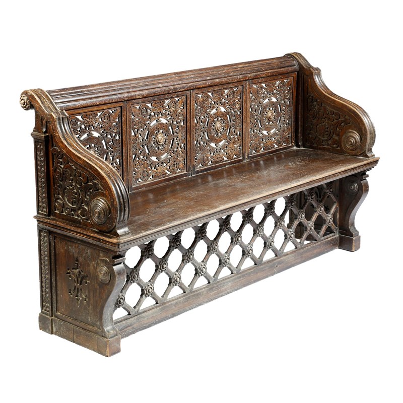 A Victorian carved oak and pine hall seat in the manner of Richard Bridgens, with a quadruple fretwork panelled back with fluted scroll arms, with blind fret carved panels, above a conforming base, with a lattice panel carved with rosettes, with traces of painted highlights, 91cm high, 164.5cm wide, 51.5cm deep.