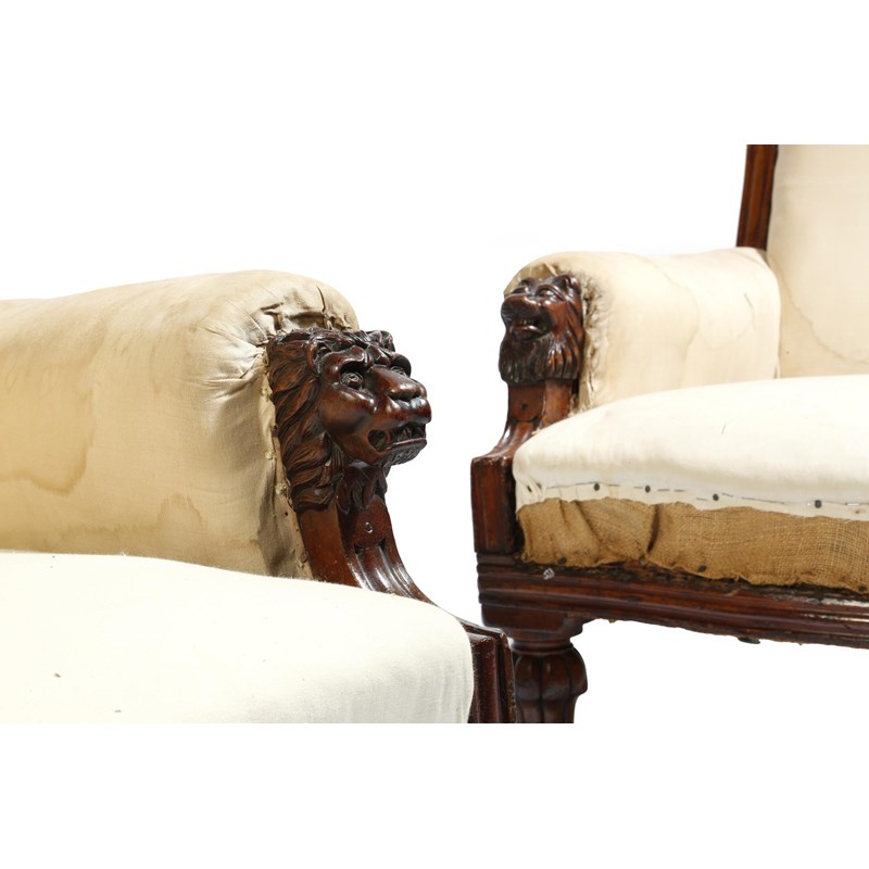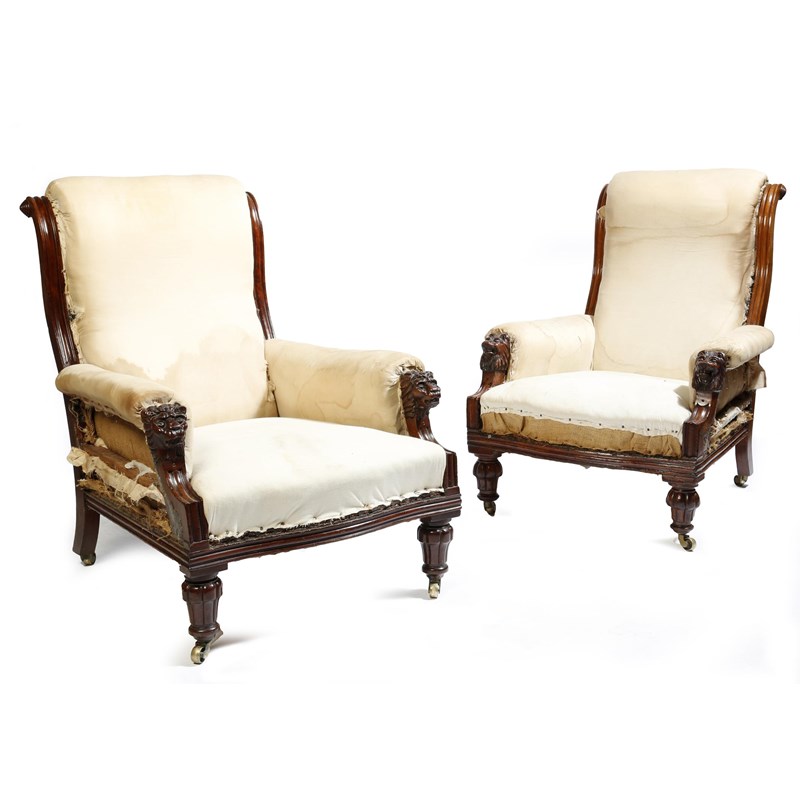 A near pair of Victorian mahogany easy armchairs, each carved with lion's head arm terminals, on lobed tapering front legs and brass castors. (2)