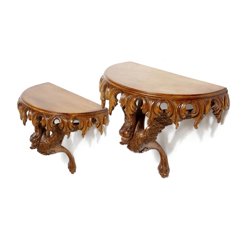 A pair of north European carved satinwood wall brackets, each with a leaf frieze, above a swan and lion's paw monopodia, 18.4cm high, 21.7cm wide. (2)