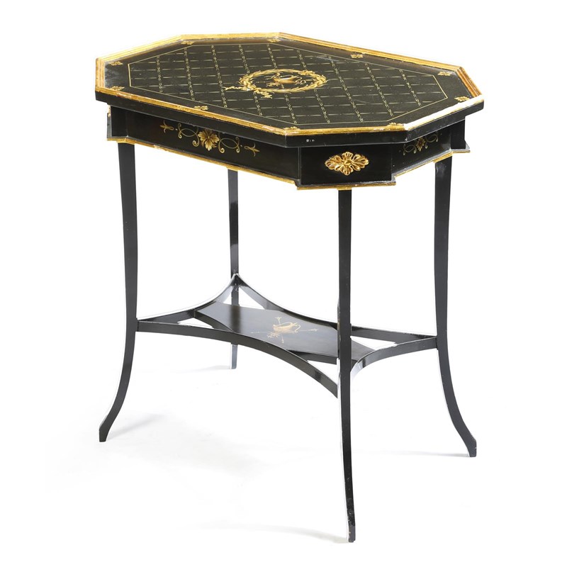 A modern ebonised occasional table by Thomas Messel, with parcel gilt decoration, 68cm high, 66cm wide, 47cm deep.