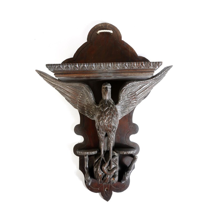 A late Victorian mahogany and pine wall bracket, carved with an eagle, a snake and a pair of fish, the back inscribed 'Made By William Lyons Pastarey, October 1891', 73.5cm high, 53cm wide.