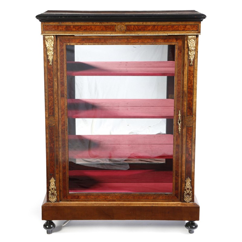 A Victorian walnut and ebonised display cabinet, with gilt brass mounts and thuya banding, the interior with a mirrored back and three plush lined shelves, 107.1cm high, 77cm wide, 31.7cm deep.