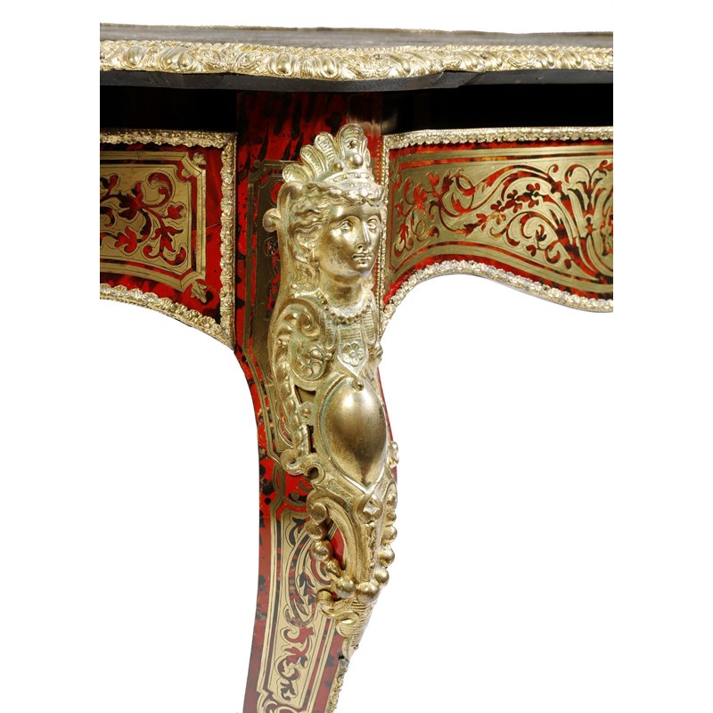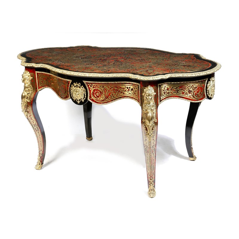 λ A 19th century French boulle marquetry centre table, with ormolu mounts, the serpentine top with cut brass inlay on a tortoiseshell ground, with strapwork, leaves, scrolls and winged cherubs, above a frieze drawer and on cabriole legs with female bust masks, 77cm high, 147.8cm wide, 88.5cm deep.