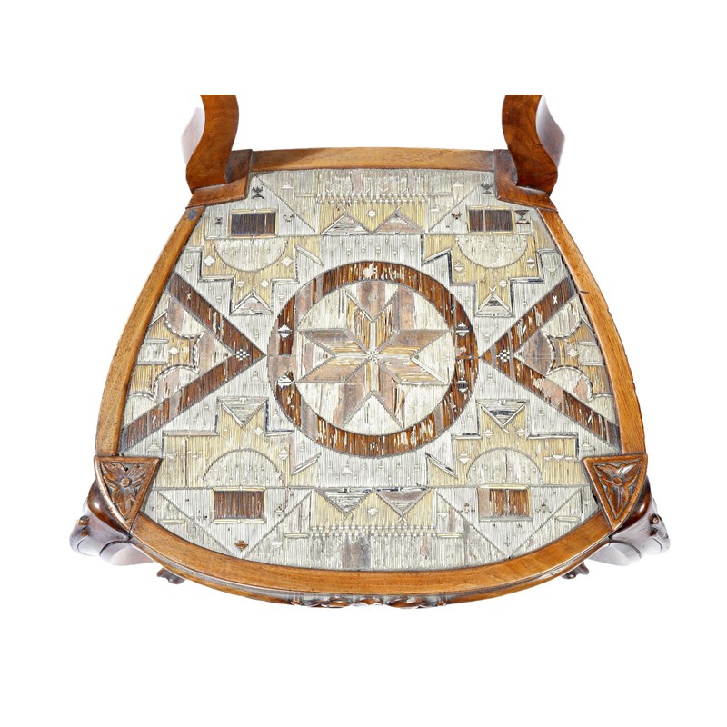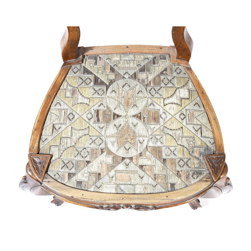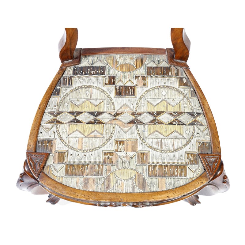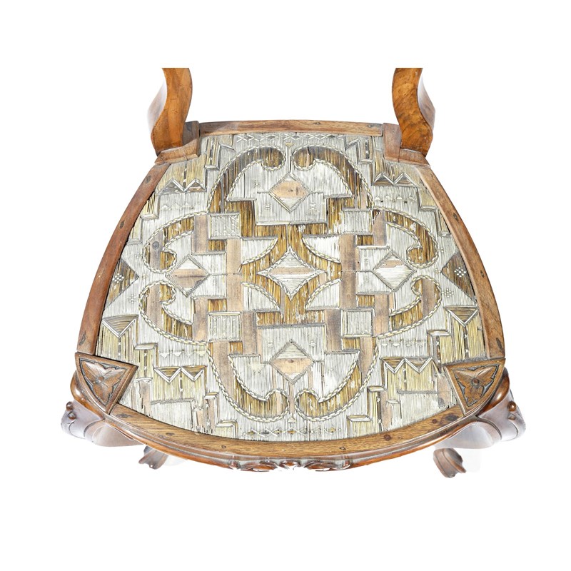 Four 19th century Anglo-American walnut side chairs, each with a scroll decorated back above a native American Micmac porcupine quill seat, with geometric decoration, on moulded cabriole legs. (4)