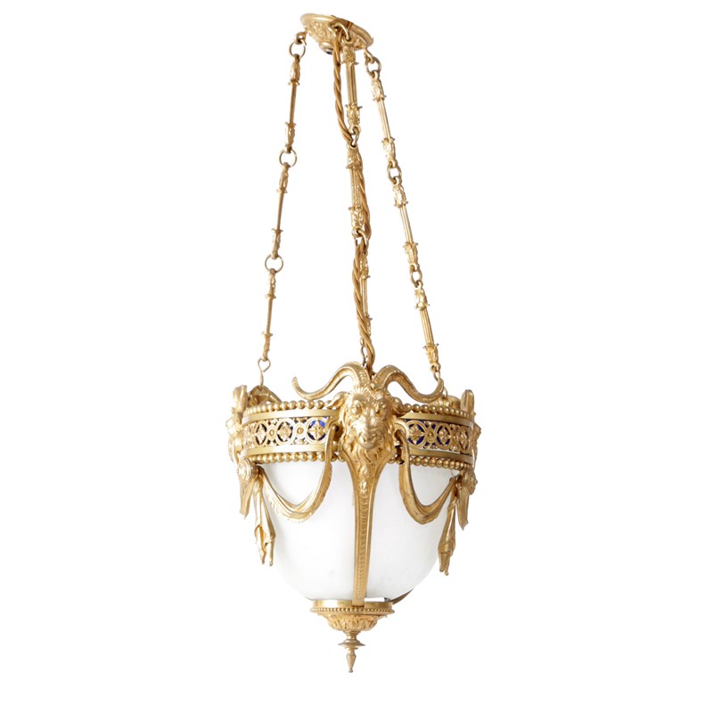 each with an ogee bowl suspended from three foliate chains to a rim of goats heads, swags and vitruvian style scrolls, with a foliate and turned finial, with three frosted glass panes and blue backing to the rim, one light lacking one pane (2)