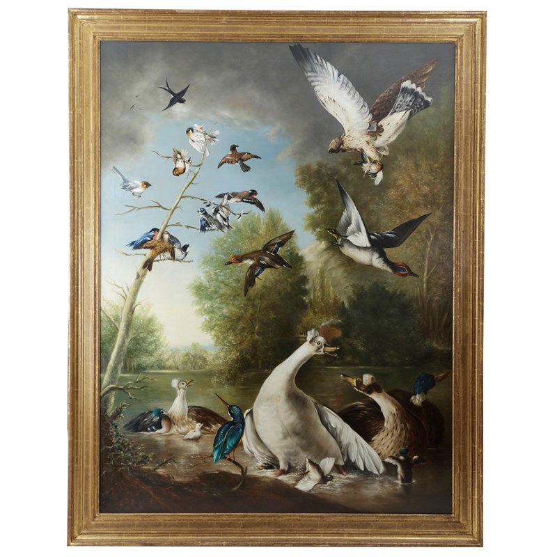 Φ A LARGE OIL PAINTING OF BIRDS AND WATER FOWL