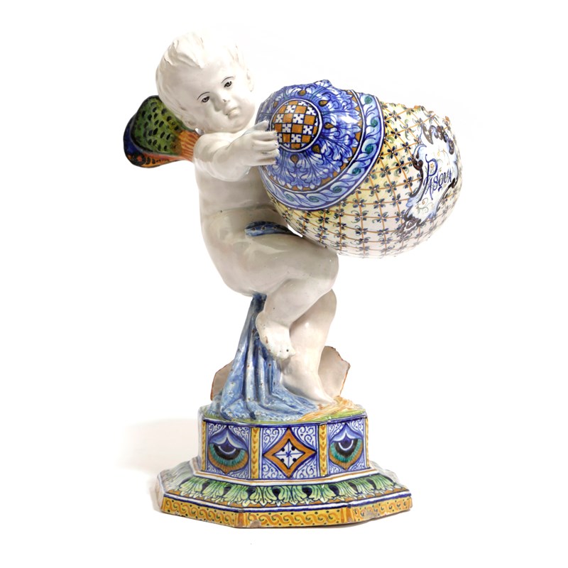 modelled as a cherub holding a large egg shell inscribed 'Pasqua', on a stepped, octagonal base, with painted cockerel mark