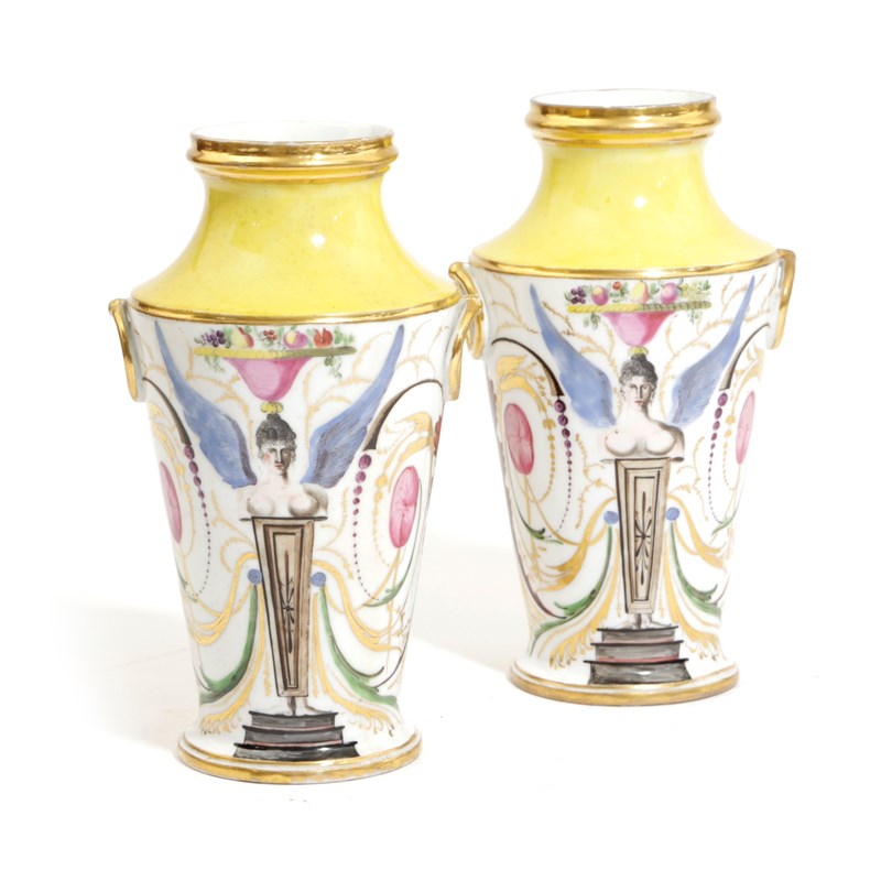 each of shouldered form, painted with classical female busts on podiums, surrounded by paterae and swags, beneath a yellow and gilt neck and ring handles (2)