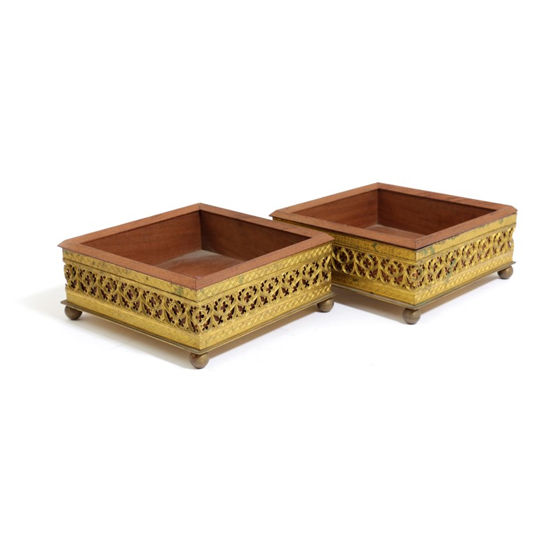 of square form, with pierced Gothic tracery between flowerhead diaper borders, on ball feet (2)