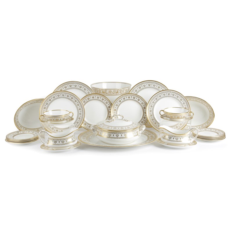 in the Gold Victoria pattern of a band of gilt anthemion, comprising ten 10 1/2" dinner plates, twelve 9 1/2 " entree plates, twelve 8 1/2" dessert plates, twelve 6 1/4" side plates, twelve soup cups and saucers, one oval platter, two oval vegetable dishes, four tureens and covers, two sauce boats and stands and one fruit bowl; together with a graduated set of five Wedgwood platters in the Gold Florentine pattern and eight Guerin-Pouyat-Elite Ltd, Limoges plates with tooled gilt decoration (A lot)