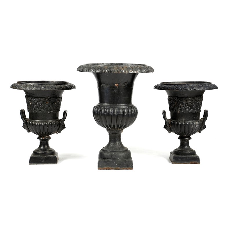 of campana shape, the bodies decorated with scrolling leaves and flowers and with lions masks handles, together with a larger cast iron campana urn (3)
