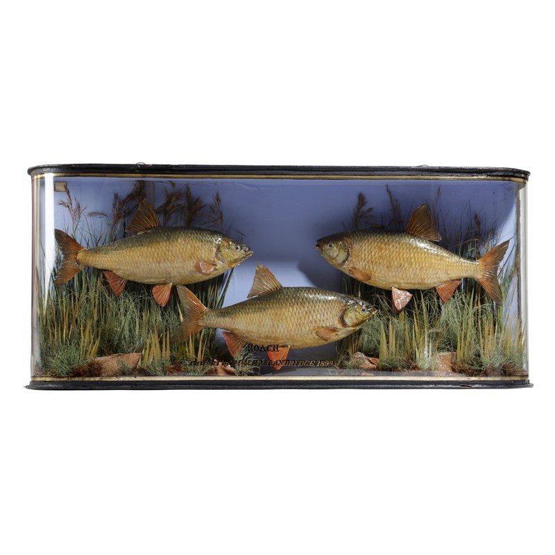 in a naturalistic setting, in an ebonised and gilt glazed bowfront case, inscribed 'ROACH, caught by Miss E. M. DANDRIDGE, 1899.'