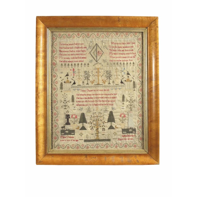 A Regency Adam and Eve sampler, Maria Overton finished this work in the 12 year of her age August the 4th 1812, worked three verses, birds, a crowned lion within a diamond shield, trees, insects, animals, two garden temples with cherubs, a shepherd and a shepherdess with sheep, with a tooth inner border, the outer border of trailing florets, 16 x 12.5in (40.5 x 32cm).