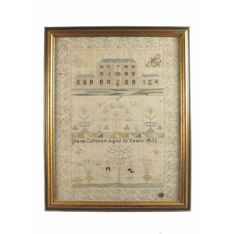 A Regency sampler, Jane Coltman, Aged 10 Years, 1813, worked a three storey house with winged insects, below with plants and birds, the base with Adam and Eve, further plants, insects and a swan, within a stitched border surrounded by a foliage outer border, 22 x 17in (56 x 43cm).