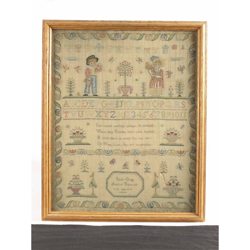 A Regency sampler, Sarah Grigg, Aged 12 Years AD 1821, worked lettered crowns, two children, the boy holding berries and the girl with a squirrel on her shoulder, flanked by birds, insects and plants, above the alphabet, numbers and verse to further plants and insects, within a scrolling leaf and fruit border, 16 x 12.75in (40.5 x 32.5cm).