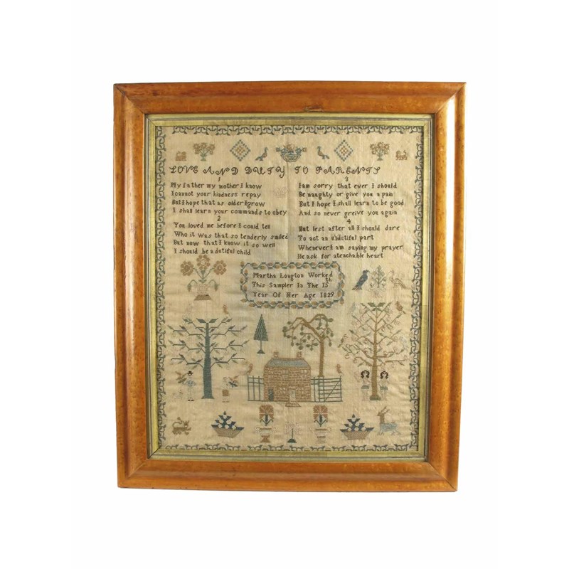 A George IV sampler, Martha Longton, Worked This Sampler In The 15th Year Of Her Age 1829, worked flowers, birds and lions above a four part verse 'Love and Duty to Parents', above a two storey house with railings and gate and flanked by Adam and Eve and another couple by a tree, possibly Martha's parents, to a further lion, stag and plants to a scrolling strawberry border, 19 x 15.5in (48 x 39.5cm).