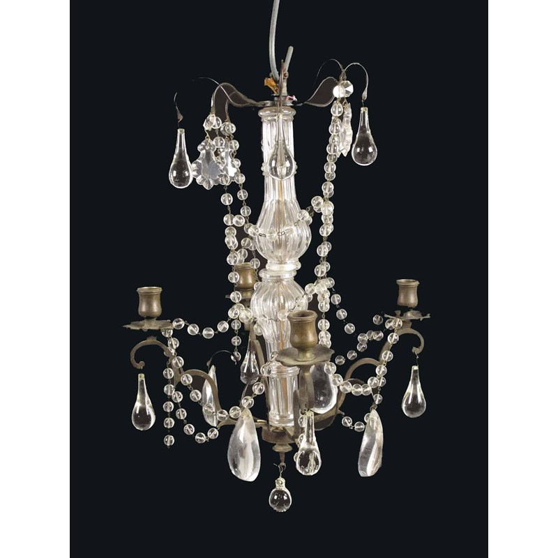 A moulded glass and brass four light electrolier, hung with beads and lustres, 20.25in (51.5cm) h, 14in (35.5cm) w, and a pair of cast brass twin branch wall lights. (3)