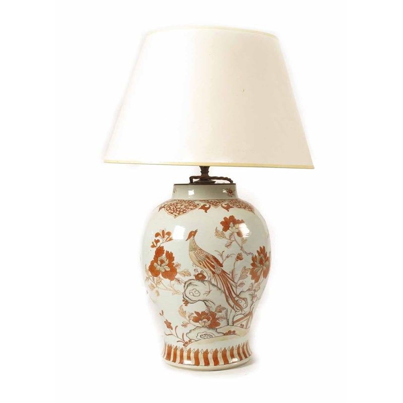 A Chinese porcelain baluster table lamp, decorated an exotic bird on chrysanthemum rock work, repairs, the base drilled, with shade, 24.25in (62cm) h.