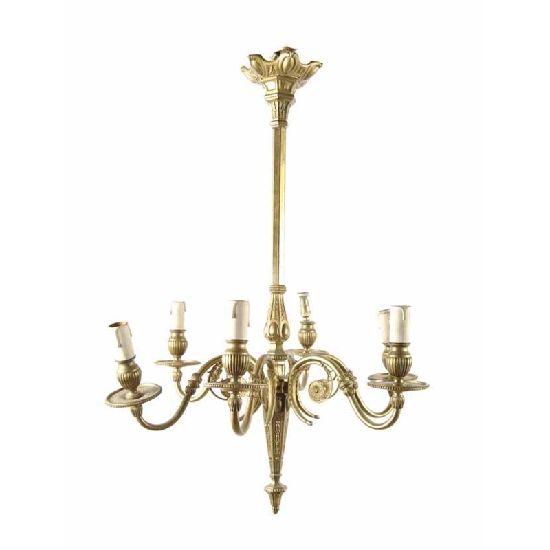 A gilt brass six light chandelier, with a long faceted part baluster stem issuing six knopped scroll branches with leaf decoration, having ribbed holders and beaded drip pans, with a conforming pendant base, fitted for electricity 30in (76cm) h, 21.5in (54.4cm).
