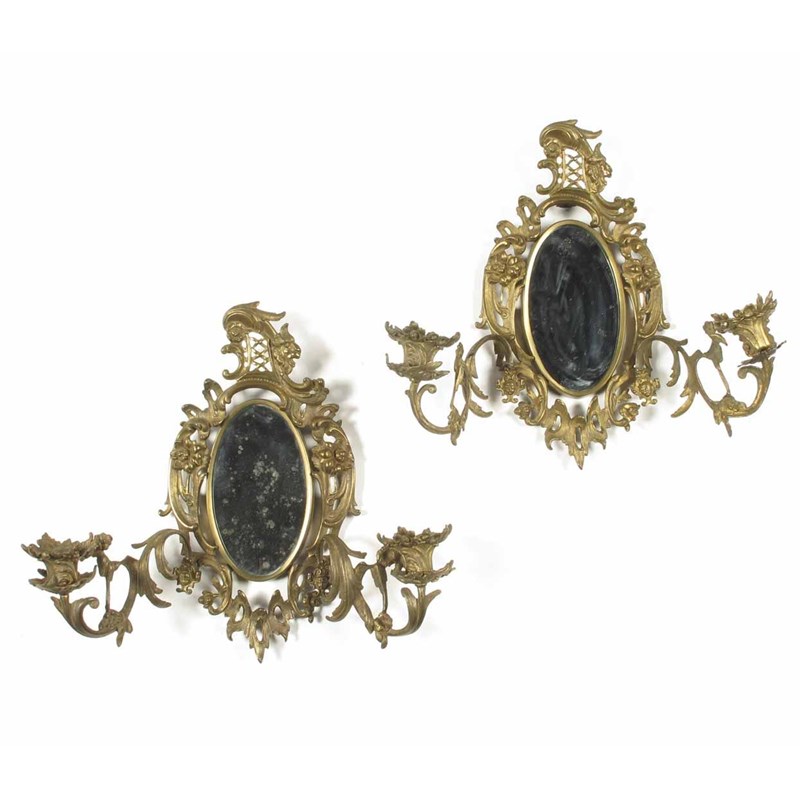 A pair of late 19th century ormolu girandoles, with an oval mirror to a rocaille frame, each with a pair of branches, 17in (43cm) h, 18.25in (46.5cm) w. (2)